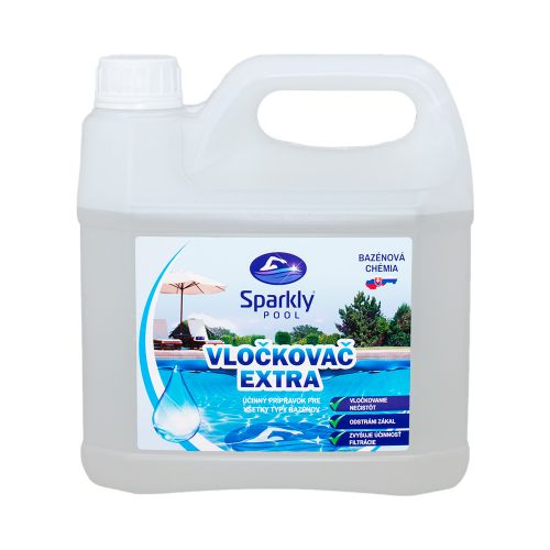 Vločkovač extra Sparkly POOL je vysoko účinný tekutý bezchlórový prípravok určený pre automatické dávkovacie systémy bazénovej chémie aj pre manuálne použitie na odstránenie zákalu vody v bazéne so sladkou aj slanou vodou a je tiež veľmi vhodný do vírivky. Použiť vločkovač sa odporúča nielen keď máme bielu až mliečnu zakalenú vodu v bazéne, ale aj preventívne každý týždeň. V bazénovej vode sa neustále tvorí jemný zákal, ktorý filtračná jednotka nie je schopná zachytiť. Tento prípravok utvorí z týchto jemných častíc tzv. vločky, ktoré už filtračné zariadenie zachytia alebo klesnú na dno bazéna, kde ich možno povysávať ponorným vysávačom. Bazénová chémia Sparkly POOL rieši každý problém s bazénovou vodou.